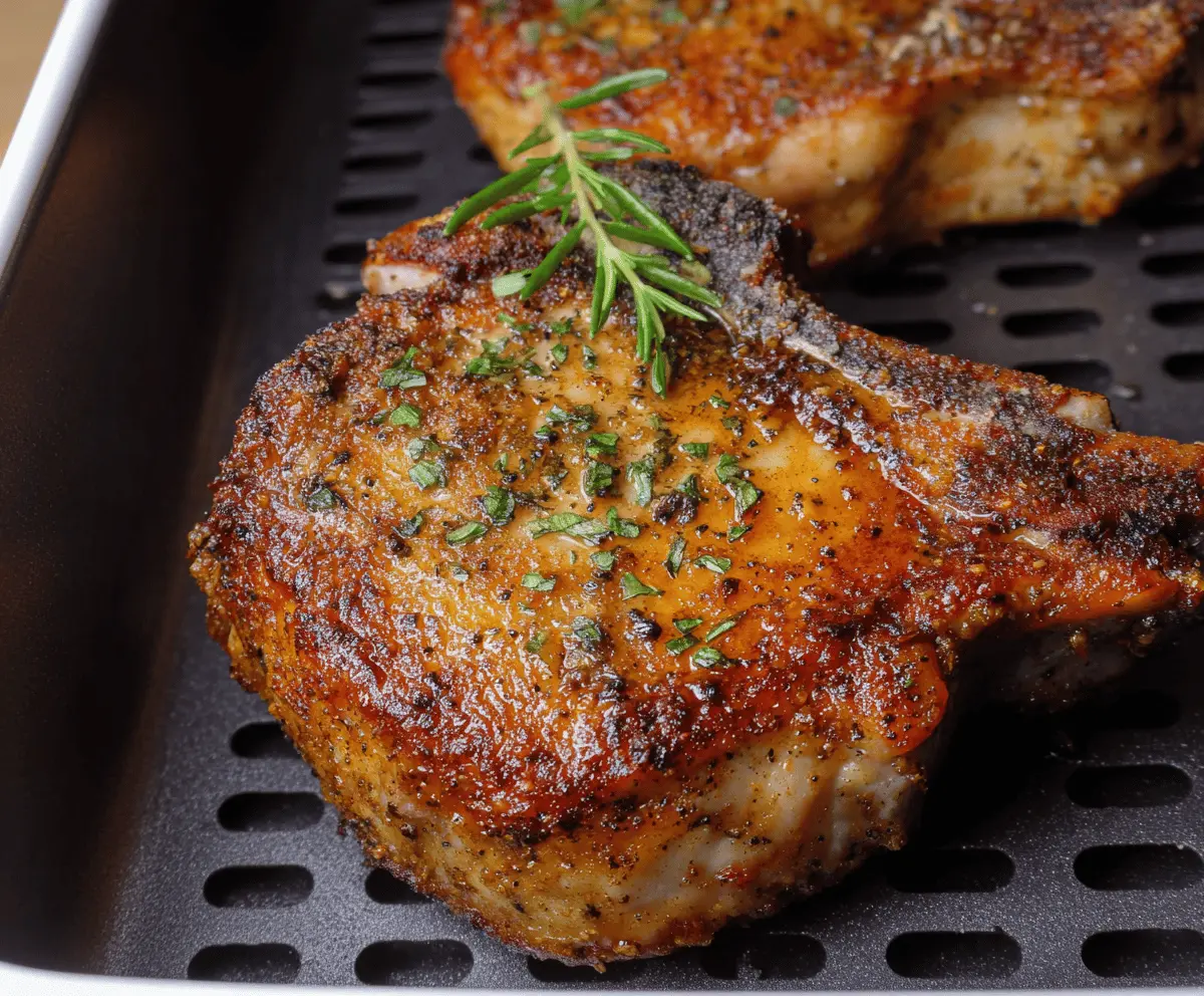 Once cooked, remove the pork chops from the air fryer and let them rest for 3-5 minutes. This helps the juices settle. Before serving, garnish with some fresh thyme sprigs for a burst of flavor!