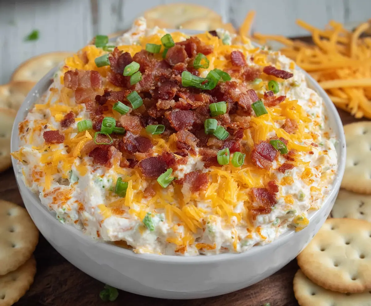 Sprinkle some additional shredded cheddar cheese over the top of the dip. Then, add a generous layer of the reserved bacon crumbles and a few sliced green onions for a fresh pop of color!