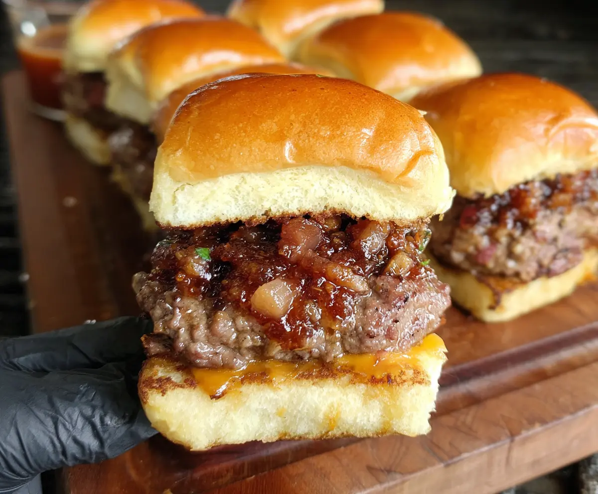 These Bacon Jam Cheeseburger Sliders are mini burgers bursting with flavor! Each slider has juicy beef, melted cheese, and sweet, sticky bacon jam that makes every bite heavenly.