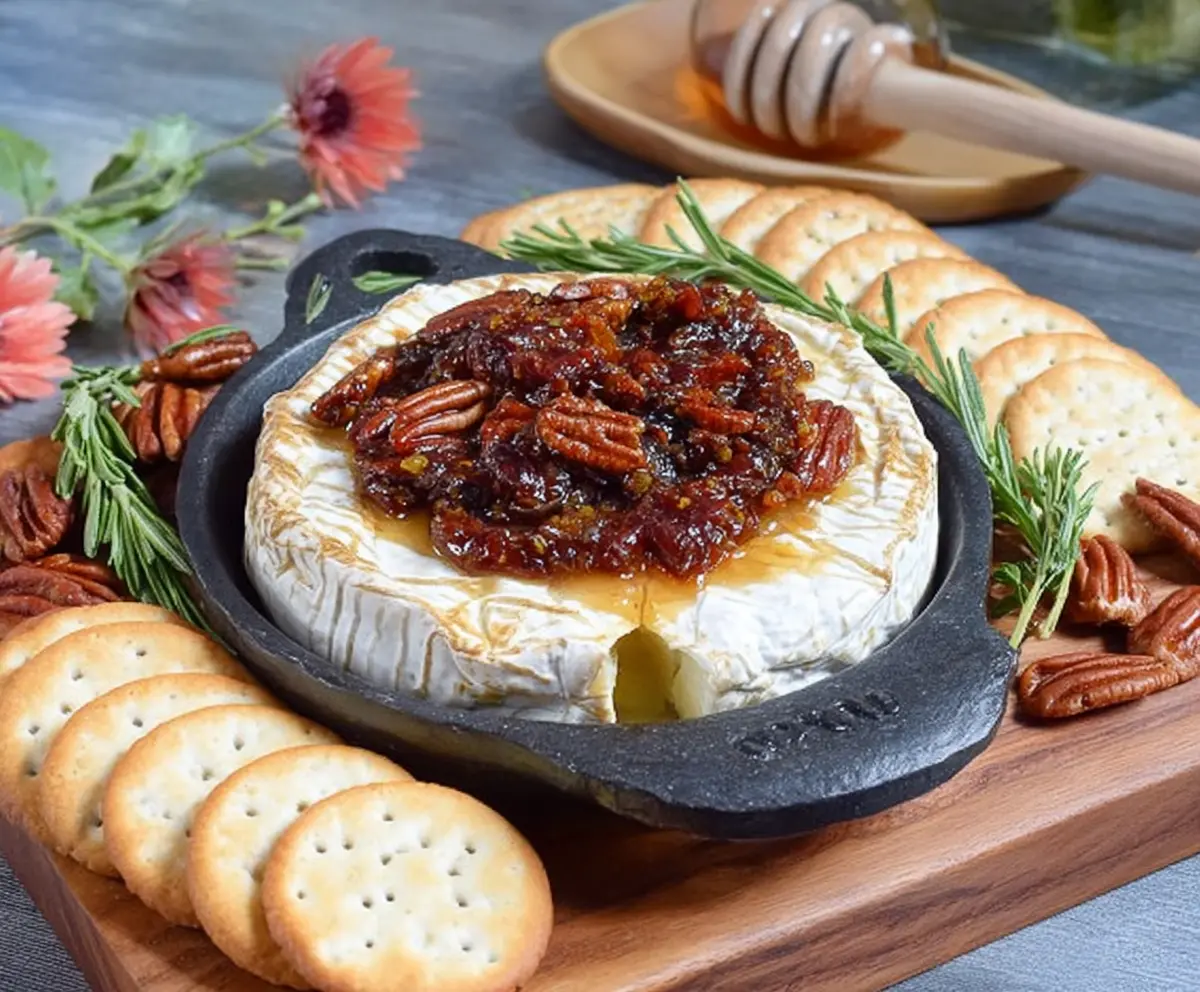 This Baked Brie is a warm and gooey delight topped with sweet fig jam and crunchy pecans. It’s perfect for sharing at parties or enjoying during a cozy night in!