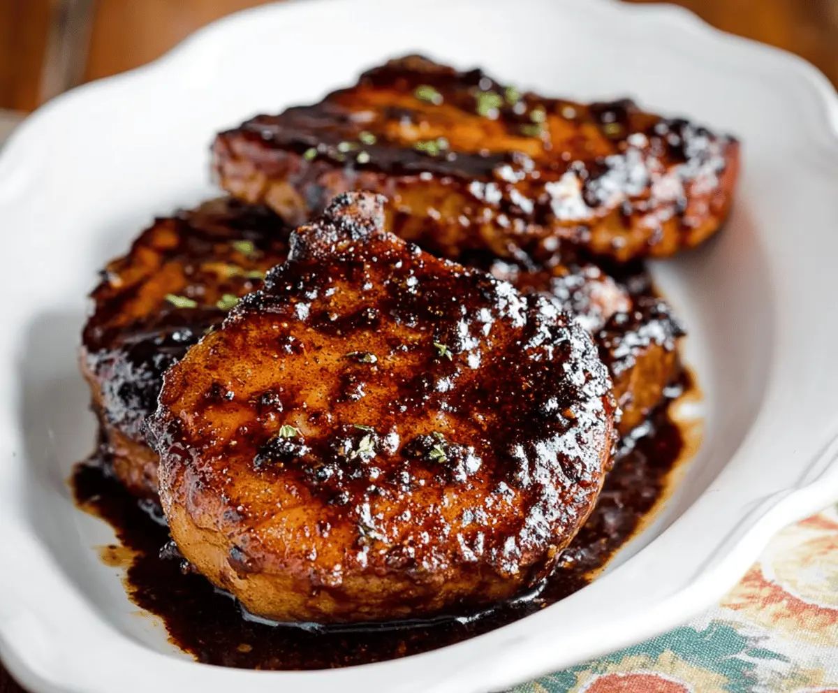 Transfer the glazed pork chops to a serving platter. Drizzle any remaining glaze from the pan over the pork. If you’d like, garnish with freshly chopped parsley or thyme for a pop of color and freshness. Serve hot and enjoy your delicious meal!