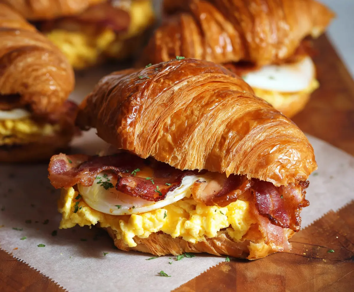Enjoy your flaky, buttery croissant wrapped around fluffy eggs and crispy bacon for a satisfying breakfast treat!