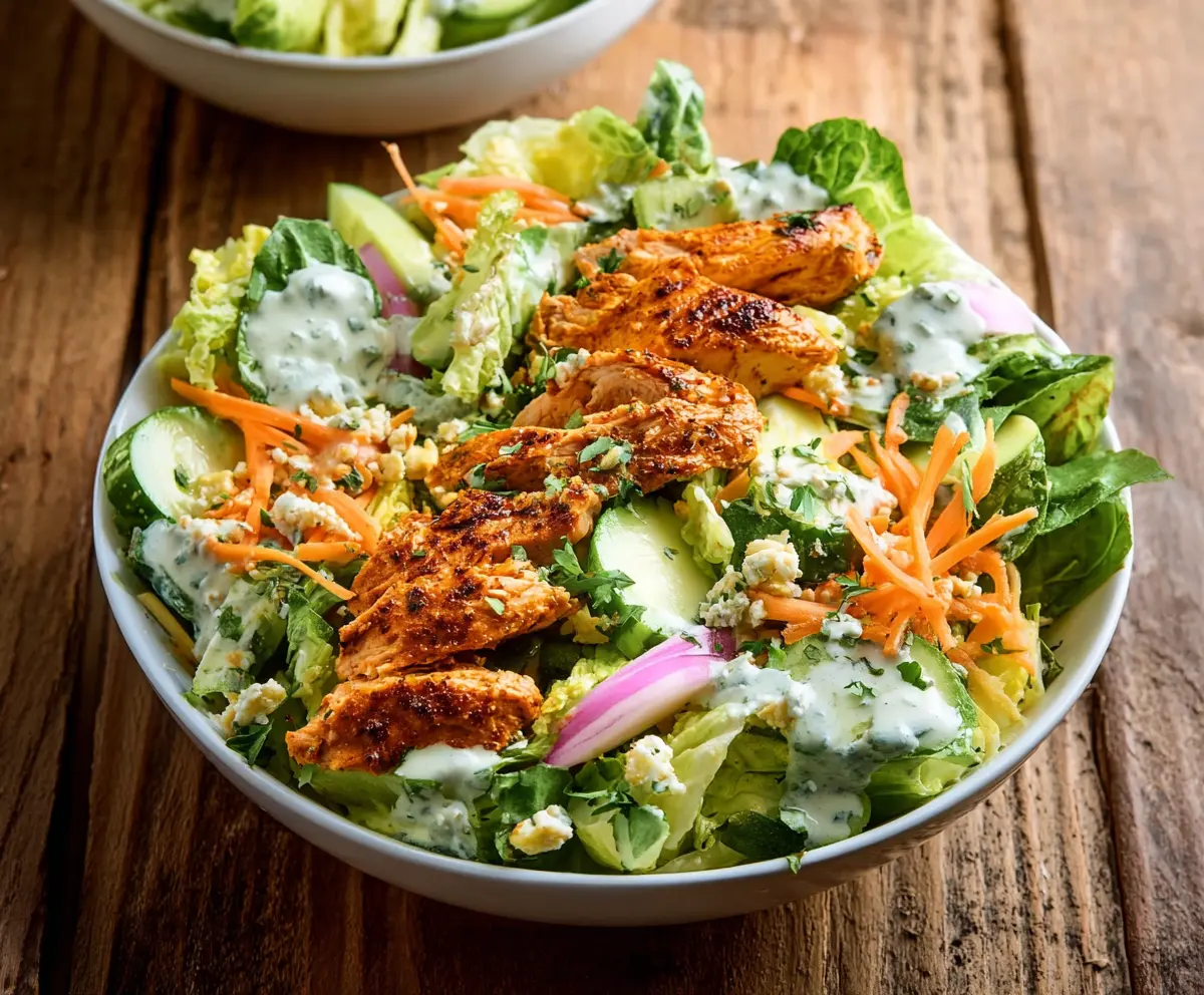 Now, place the buffalo chicken strips right on top of the salad mixture. Just before serving, drizzle your homemade ranch dressing over the salad. You can toss it lightly to combine if you’d like.