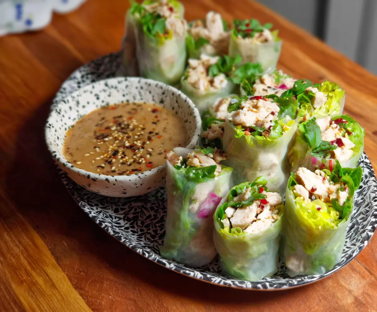 Enjoy these fresh and flavorful Caesar Chicken Rice Paper Rolls as a light appetizer or meal!