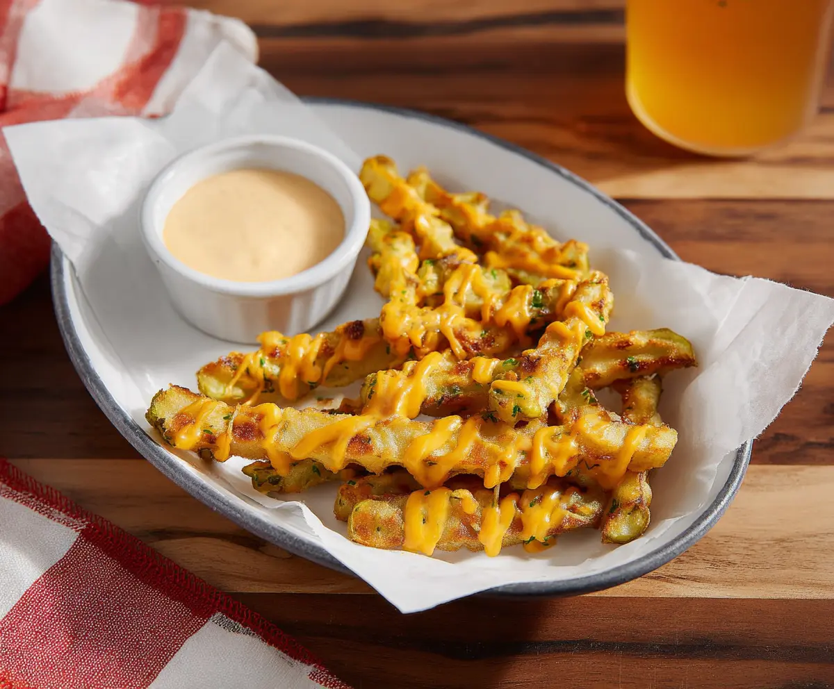 Finally, drizzle some melted cheddar over the fries or leave it in a nice layer. Serve these Cheddar Pickle Fries immediately with your tangy dipping sauce on the side. Enjoy every crispy, cheesy bite!