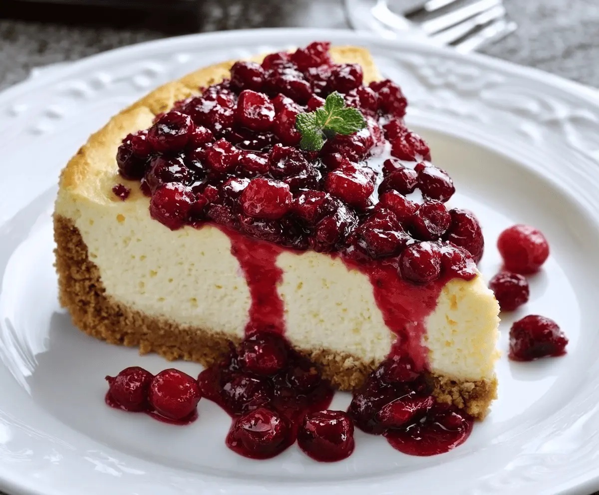 Enjoy your creamy cheesecake with vibrant cranberry topping—decadent, tart, and perfect for any occasion!