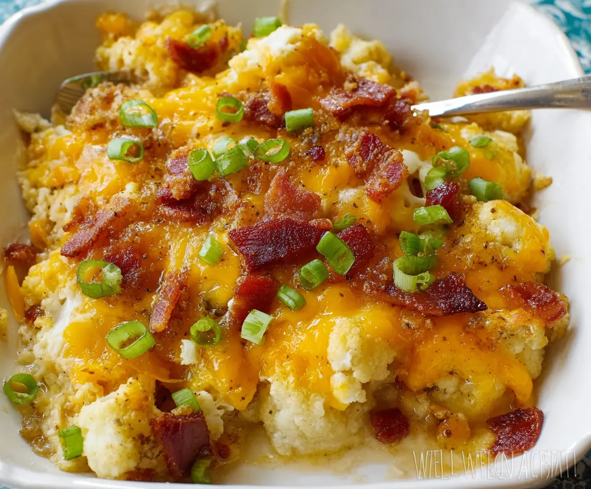 This Cheesy Loaded Cauliflower Casserole is a warm, cheesy hug in a dish! It features tender cauliflower mixed with creamy cheese and topped with crispy bits for a perfect crunch.