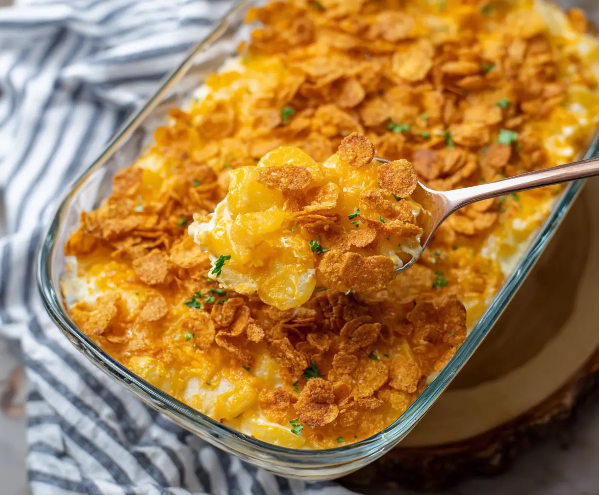 These cheesy potatoes topped with crunchy corn flakes are a hit at any gathering! They are creamy, cheesy, and oh-so-comforting. Great for making everyone smile.
