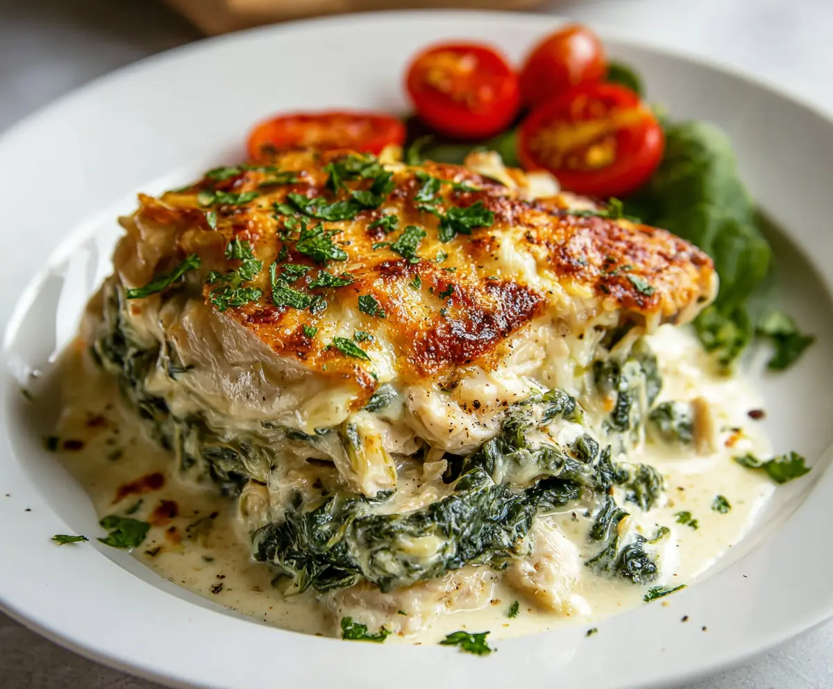 If you’d like, sprinkle some fresh parsley on top for a pop of color. Then, serve warm and enjoy your creamy, cheesy chicken and spinach casserole!