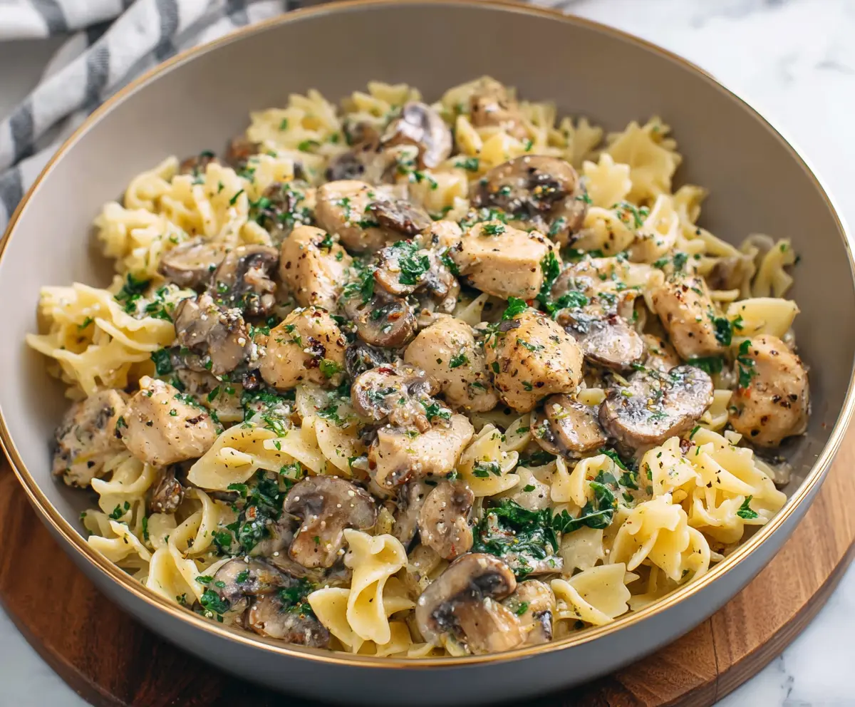 Return the cooked chicken (and bacon if you used it) back to the skillet, stirring to coat everything in the creamy mushroom sauce. Finally, add the cooked pasta to the skillet and gently toss everything to combine and heat through.