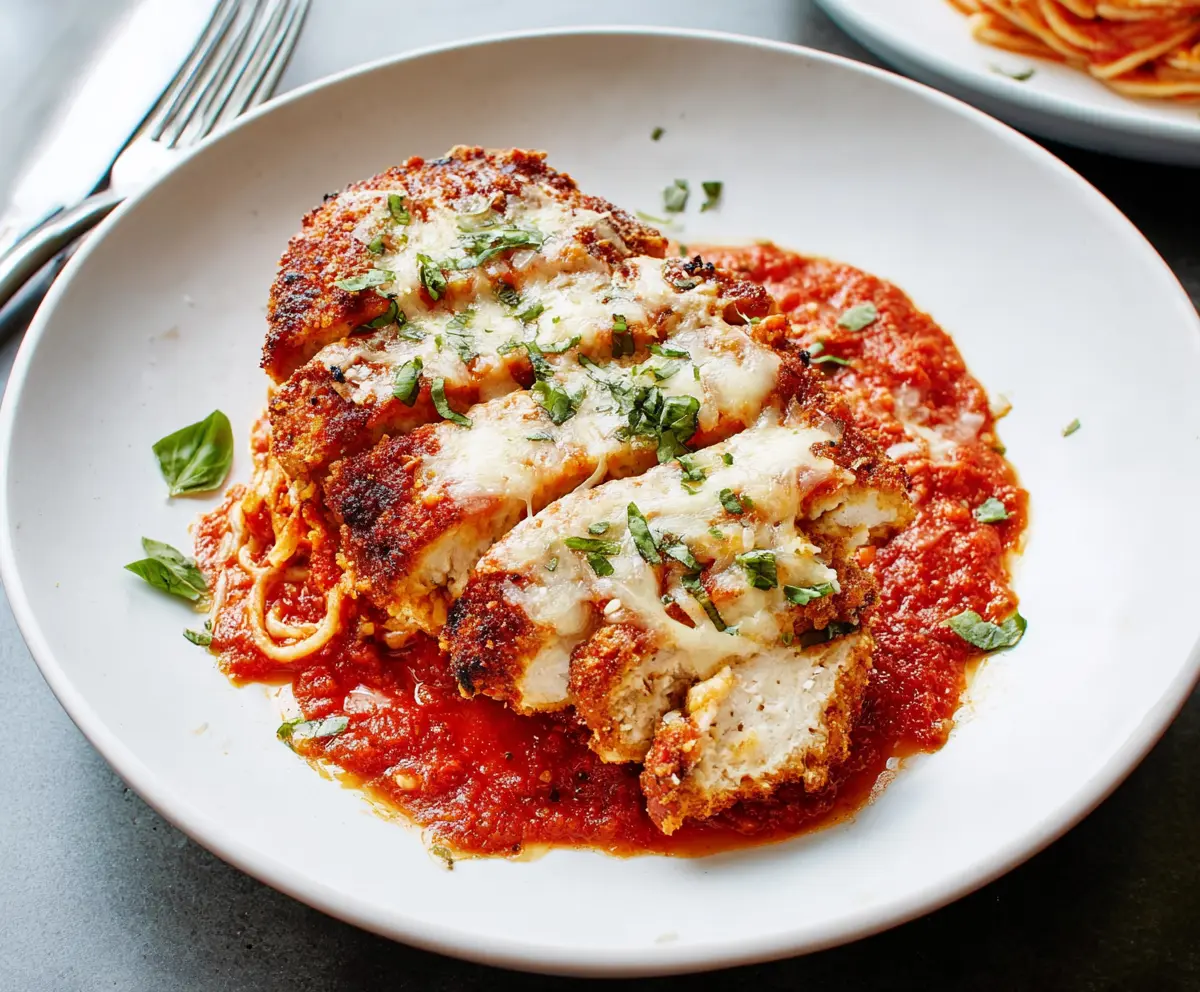 Once out of the oven, garnish your Chicken Parmesan with fresh basil slices for a pop of color and flavor. Serve hot over cooked spaghetti or your favorite pasta, with extra marinara sauce on the side. Enjoy your delicious meal!