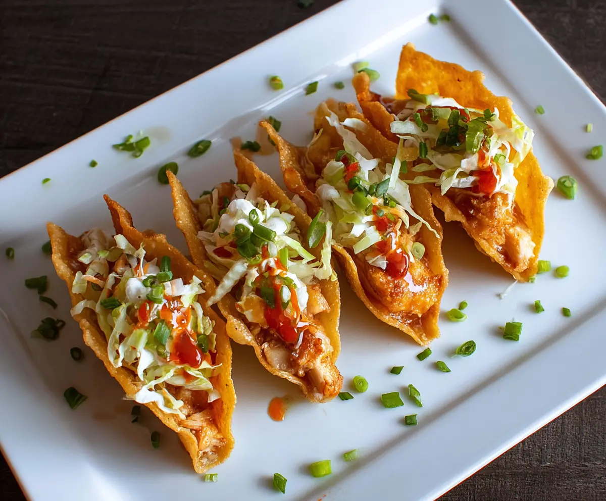 These Chicken Wonton Tacos are a fun twist on taco night! Crispy wonton wrappers hold juicy chicken and fresh toppings, making each bite a tasty treat.