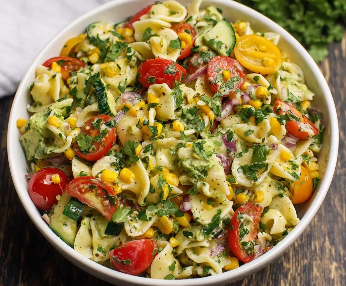 In a large mixing bowl, combine the cooled pasta with the halved cherry tomatoes, corn kernels, finely chopped red onion, and the fresh chopped cilantro. You’ll want these ingredients to blend nicely for a colorful salad!