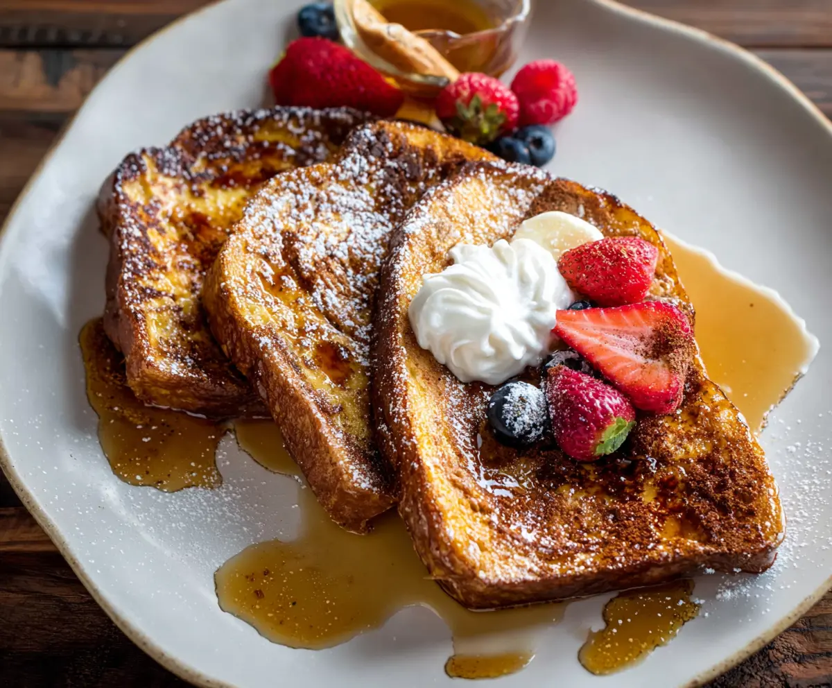 To serve the French toast, stack the slices on a plate. Drizzle some maple syrup over the top, dust with powdered sugar, and add a dollop of whipped cream. Finish off with fresh berries for a beautiful and delicious garnish.