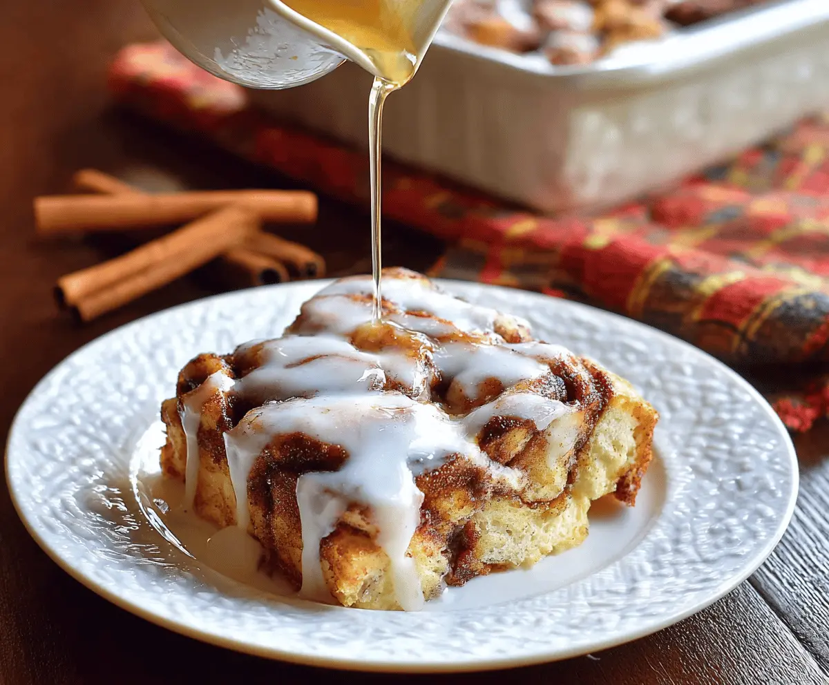 Once baked, let the casserole cool for a few minutes. Then, serve it warm, drizzled generously with the icing glaze on top. Enjoy your warm and gooey Cinnamon Roll French Toast Casserole—perfect for sharing with friends and family!