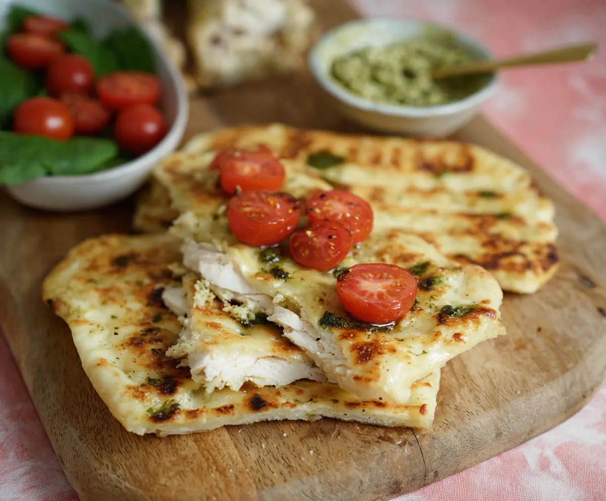 Enjoy your homemade cottage cheese flatbread topped with fresh tomatoes and vibrant pesto!