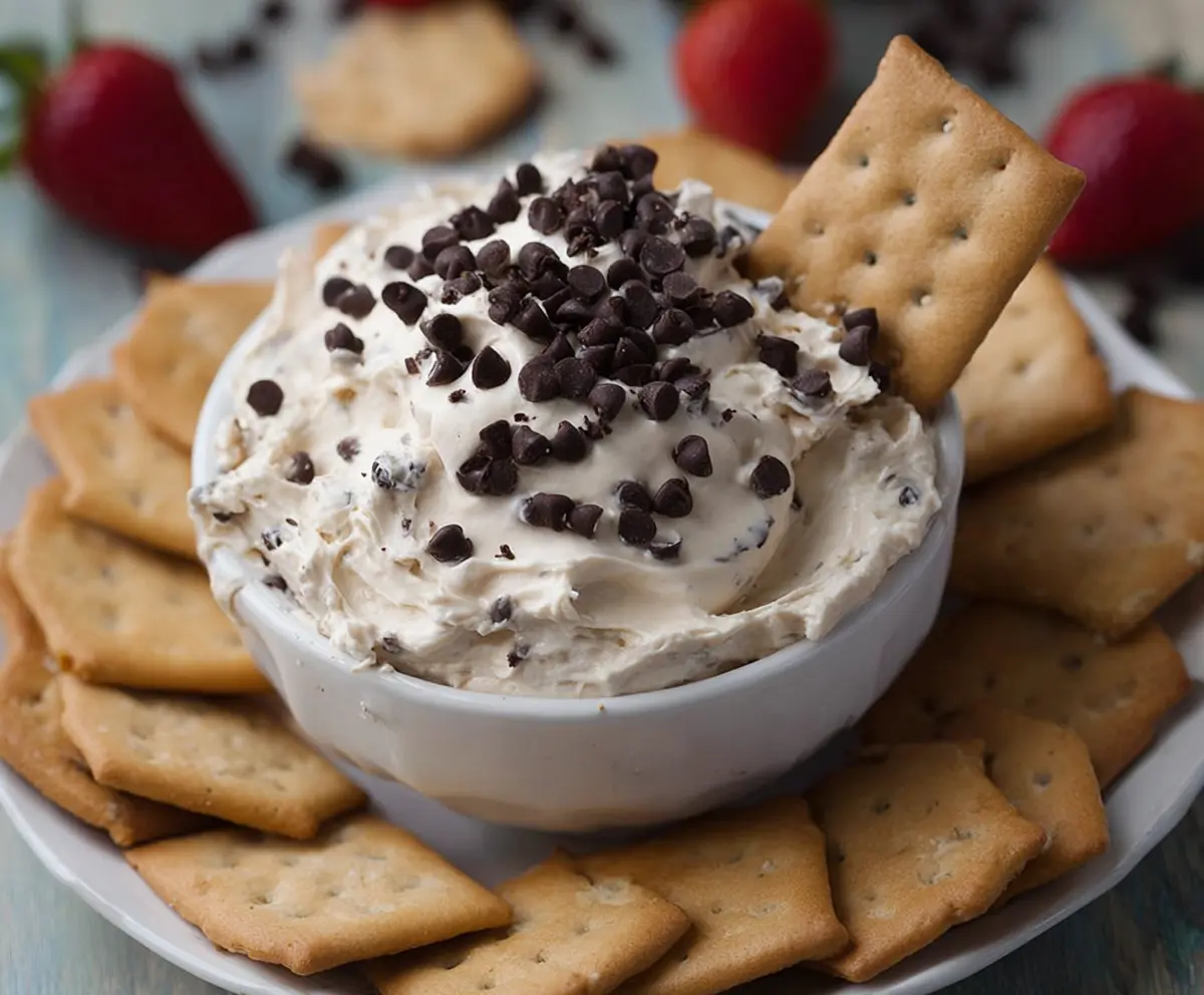 Your Cream Cheese Chocolate Chip Dip is now ready to serve! Pair it with crackers and fresh strawberries for dipping. If you have a little time, chill it in the refrigerator for 30 minutes for even better flavor!