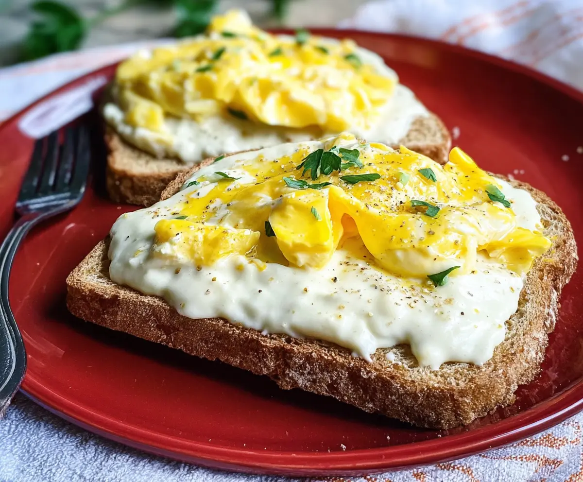 Now for the fun part! Spoon the creamed eggs mixture generously over the toasted bread. Make sure each slice gets a nice portion of that creamy goodness!