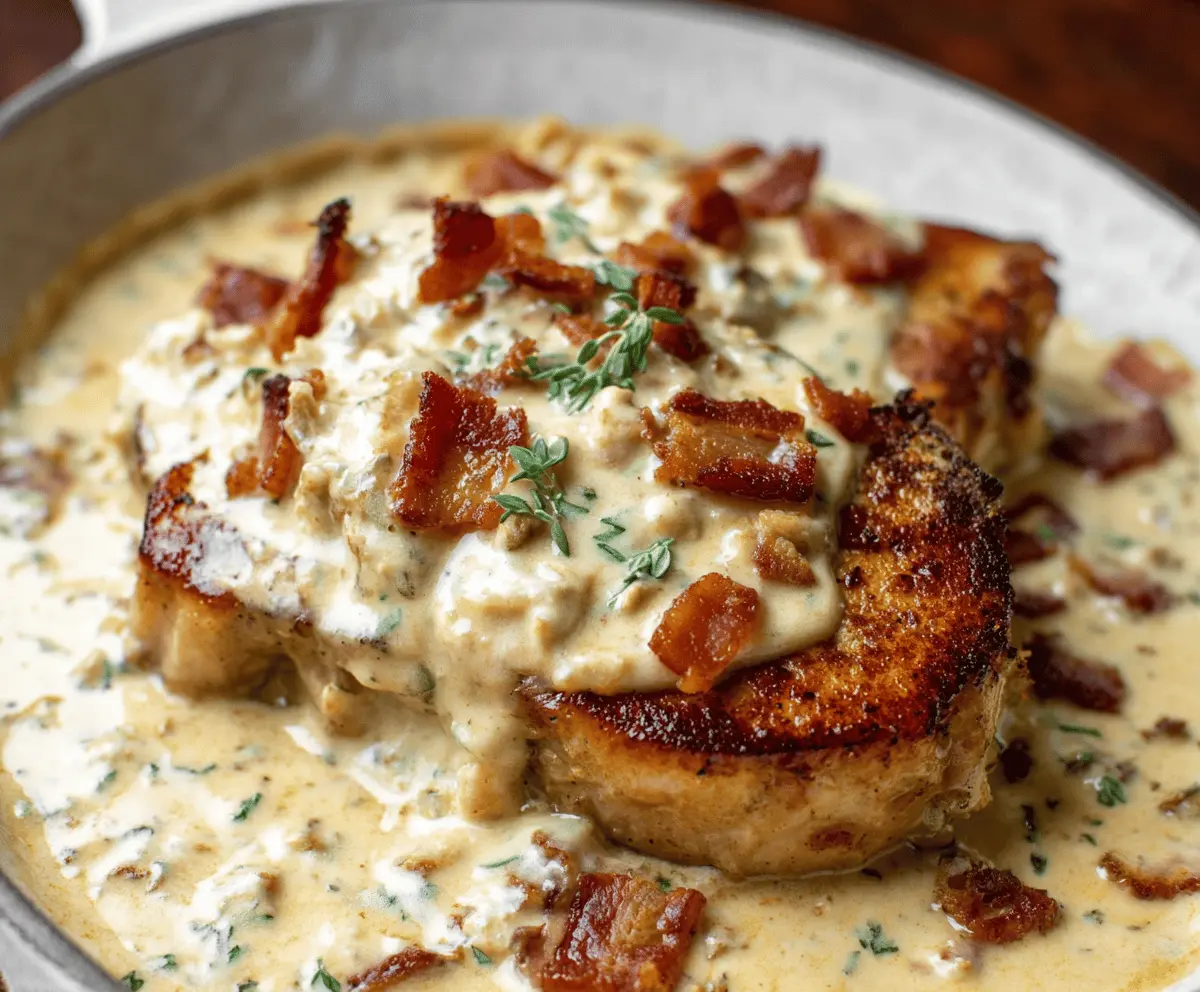 Serve the pork chops topped with that delicious creamy bacon sauce. This dish goes perfectly with mashed potatoes, rice, or even steamed vegetables for a complete meal. Enjoy your indulgent and delicious Creamy Bacon Pork Chops!