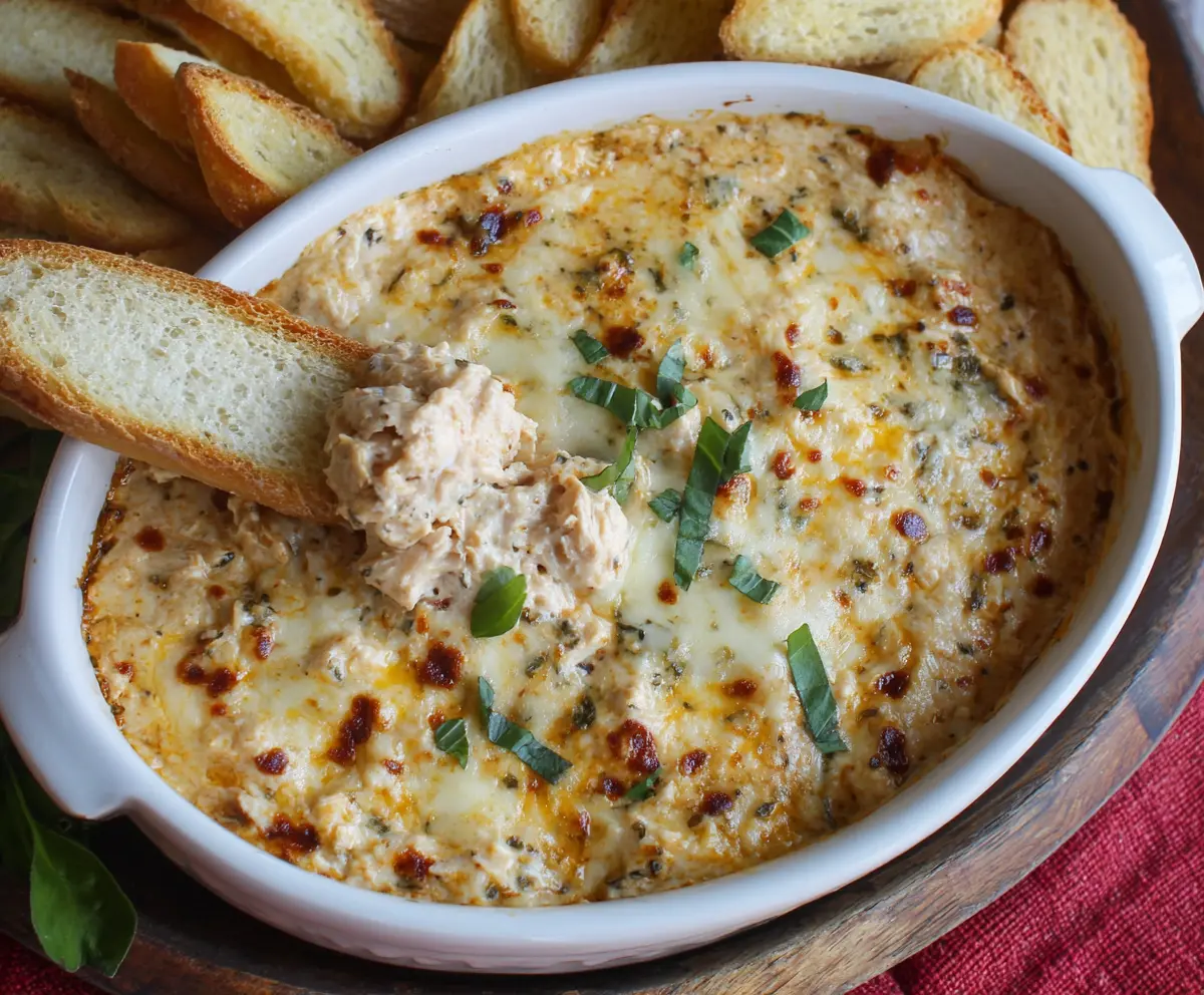 Before diving in, take a moment to garnish the dip with some extra fresh basil leaves for a pop of color and flavor. Serve the dip warm alongside sliced baguette or toasted bread rounds for the perfect dipping experience.