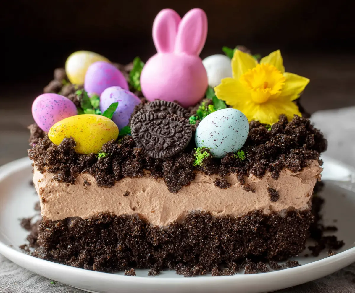 This fun Easter Dirt Cake is as cute as it is tasty! It combines chocolate pudding, creamy whipped topping, and crumbled cookies for a treat that looks like a garden party on your table.