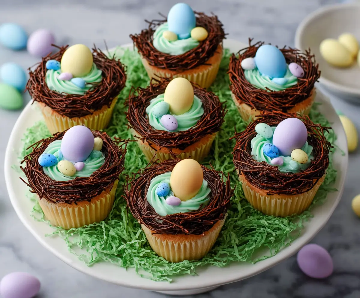 These cute Easter Egg Nest Cupcakes are a fun treat! They are soft and fluffy cupcakes topped with chocolate frosting, and the best part? They have little candy eggs tucked in for a delightful surprise.