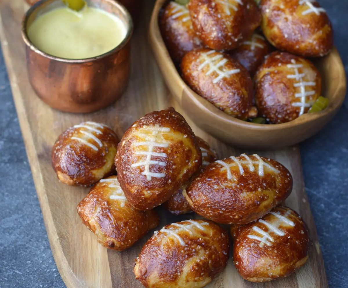 Garnish with finely chopped chives or parsley if desired. Serve your pretzel bites warm with your favorite cheese dip or mustard. Enjoy your delicious Football Shaped Soft Pretzel Bites!