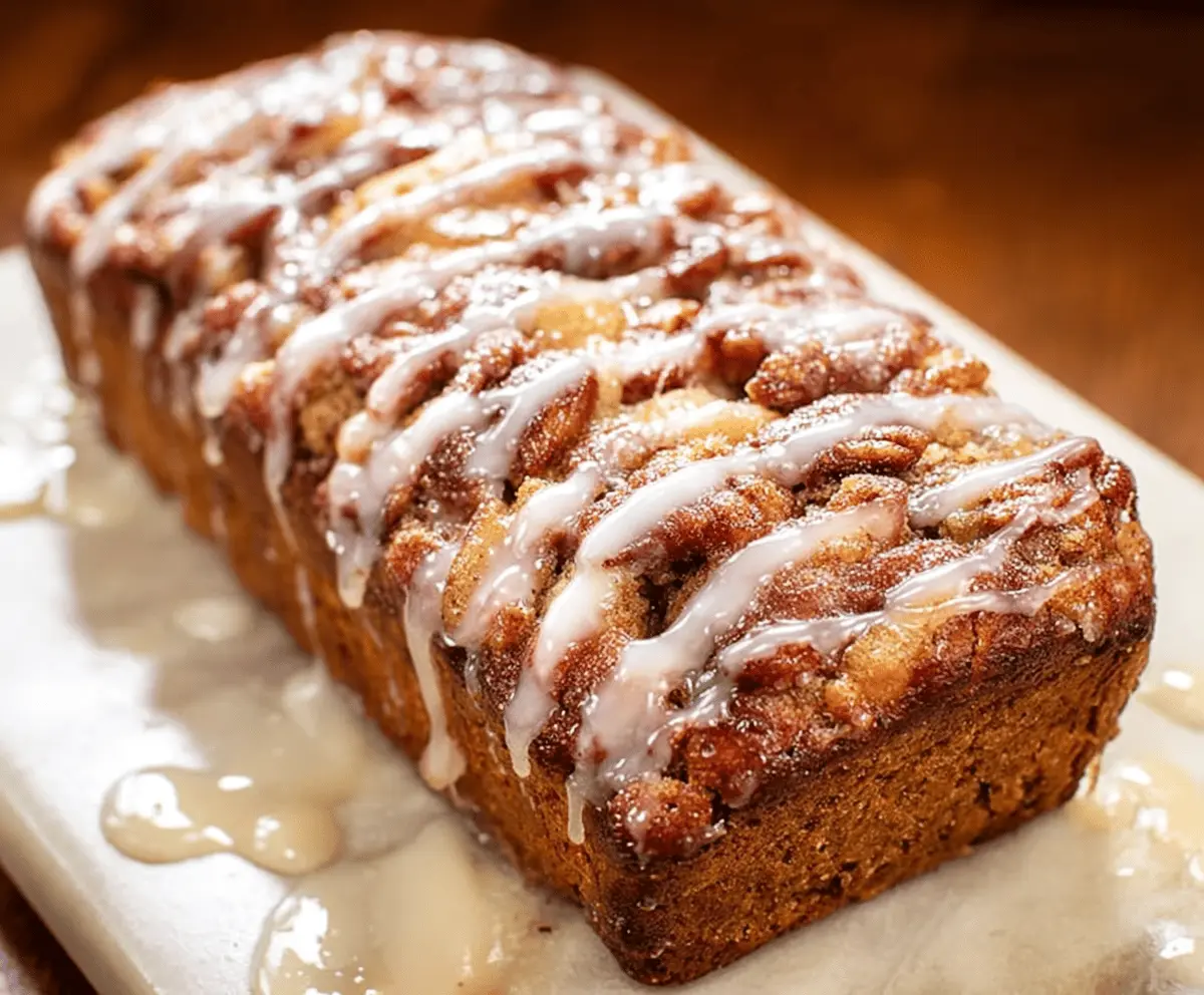 Once the bread has cooled slightly, drizzle the glaze over the top and let it set for a bit before slicing.