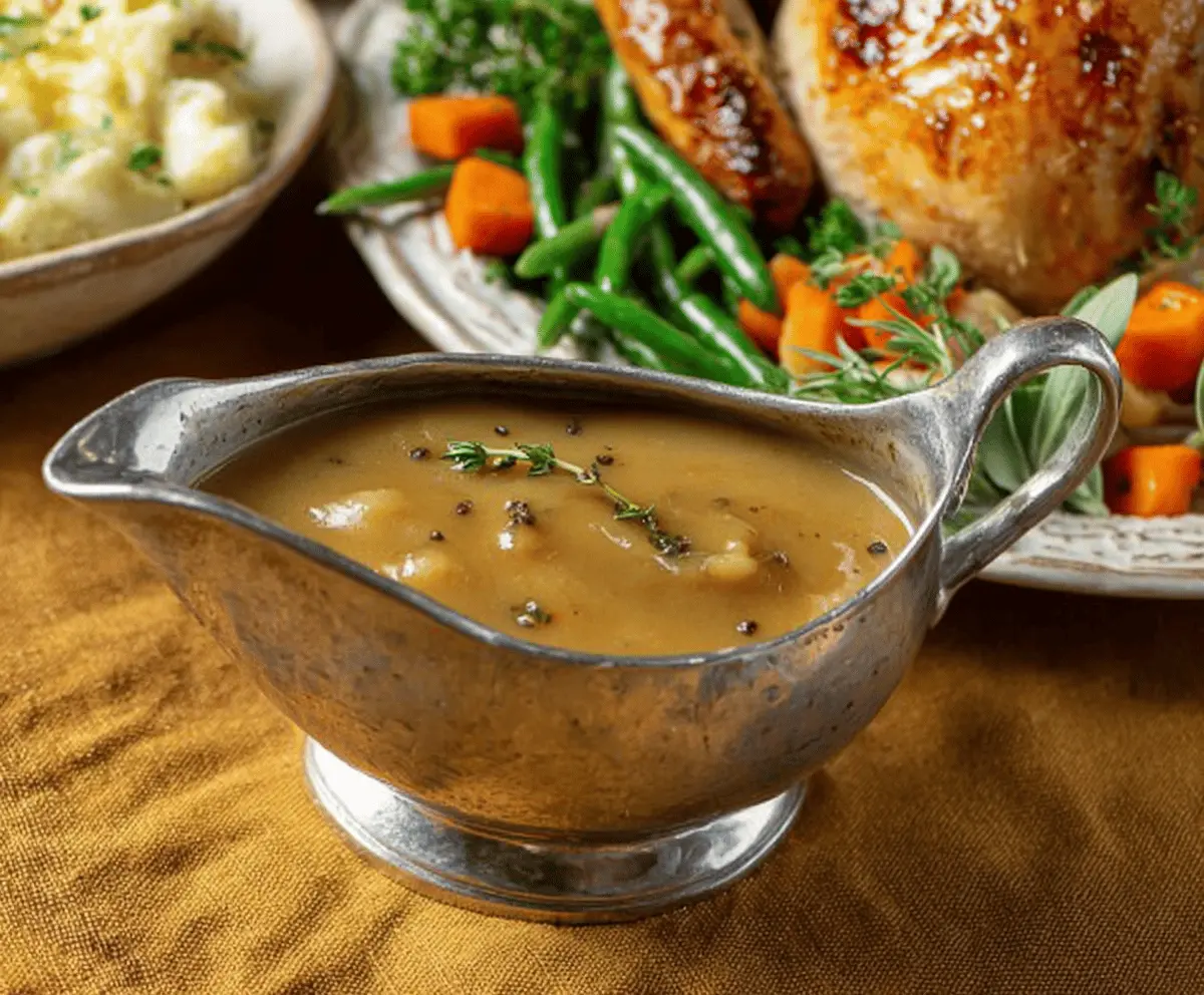 Right before serving, you can garnish your gravy with fresh thyme sprigs to add a lovely aroma and a pop of color.