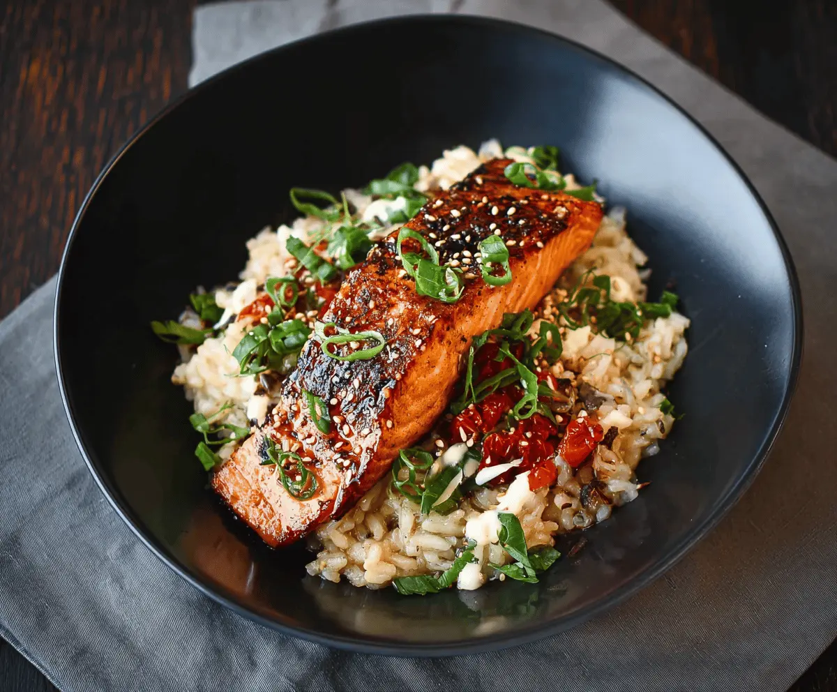 To serve, spoon the creamy Japanese-style risotto into a shallow bowl or a cast-iron skillet and top it with the beautifully seared salmon fillet.