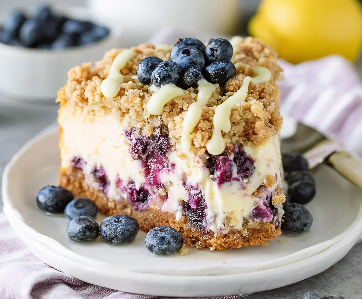 When you’re ready to enjoy your cheesecake, garnish it with some fresh blueberries and a sprinkle of lemon zest on top. Slice it up and dig in—your delicious Lemon Blueberry Crumble Cheesecake is ready to impress!