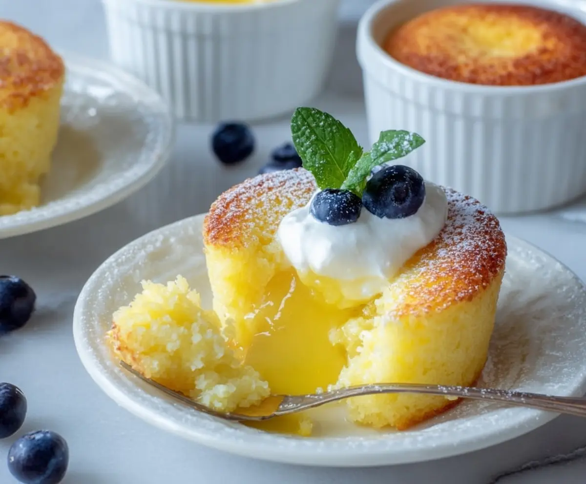 Finally, serve your lemon pudding cake warm with fluffy whipped cream and a sprinkle of fresh blueberries on the side if you like. Enjoy this refreshing dessert with friends and family!