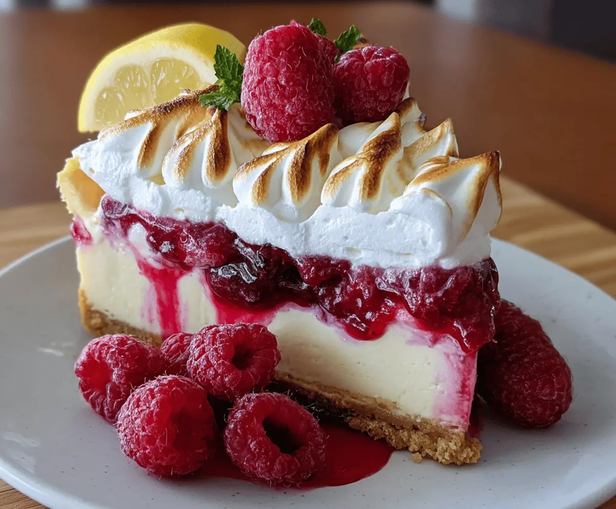 Finally, top your cheesecake with fresh raspberries for a pop of color and freshness. Serve immediately for the best texture and flavor. Enjoy every delicious bite of your Lemon Raspberry Meringue Cheesecake!