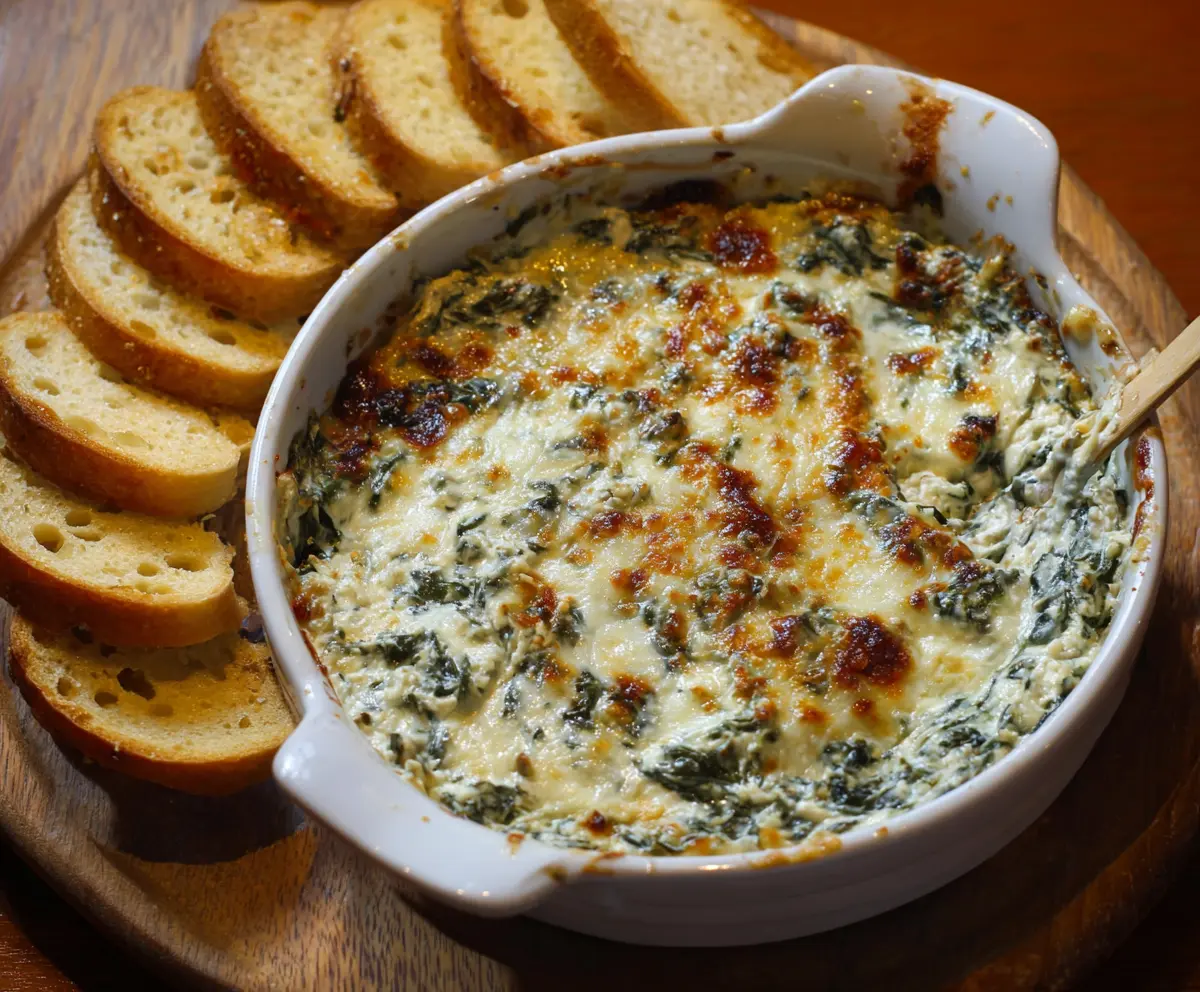 After removing the dip from the oven, let it cool for a few moments. This will make it easier to scoop without burning your tongue! Serve it warm with toasted French bread slices or your favorite dippers.