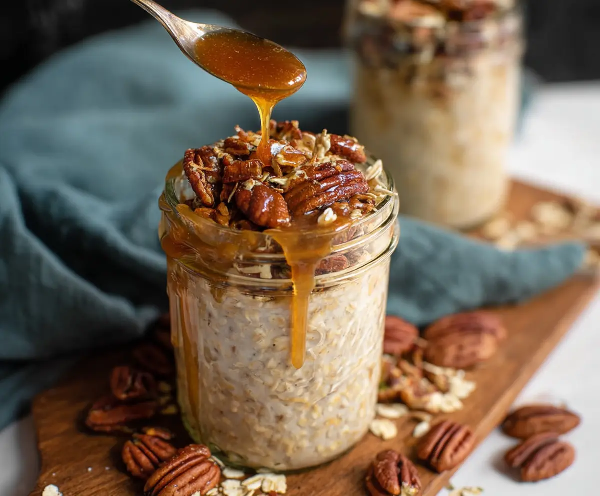 Maple Praline Overnight Oats are a sweet and nutty breakfast treat! Made with creamy oats, rich maple syrup, and crunchy pecans, these oats are ready to eat when you wake up.