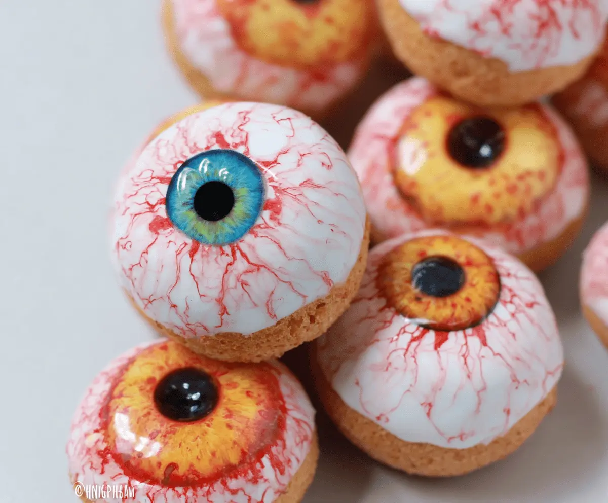 Using red gel food coloring or edible red writing icing, draw thin squiggly lines that start from the edge of the candy eyeball and stretch outward across the white glaze. This mimics the look of bloodshot veins. For extra fun, use a fine brush or toothpick to add some yellow or orange veins on a few donuts!