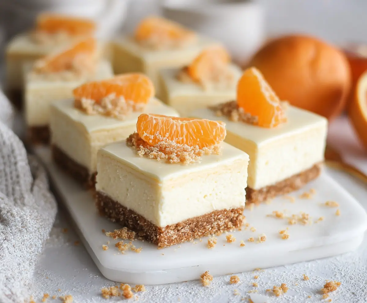 Once cooled, cover the cheesecake bars and refrigerate them for at least 4 hours, or preferably overnight, to let them fully set. Before serving, cut the cheesecake into squares. Top each bar with a fresh orange segment or mandarin slice. If you’d like, sprinkle some extra orange zest or crushed graham crackers on top for a delightful finish!