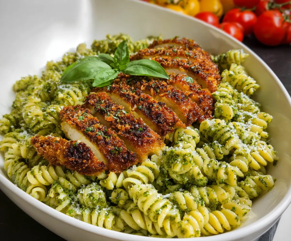 This delightful dish takes about 30 minutes to prepare and cook. You’ll spend about 10 minutes cooking the pasta and preparing the pesto, followed by another 20 minutes breading and frying the chicken, and then assembling everything. It’s quick, tasty, and perfect for dinner!