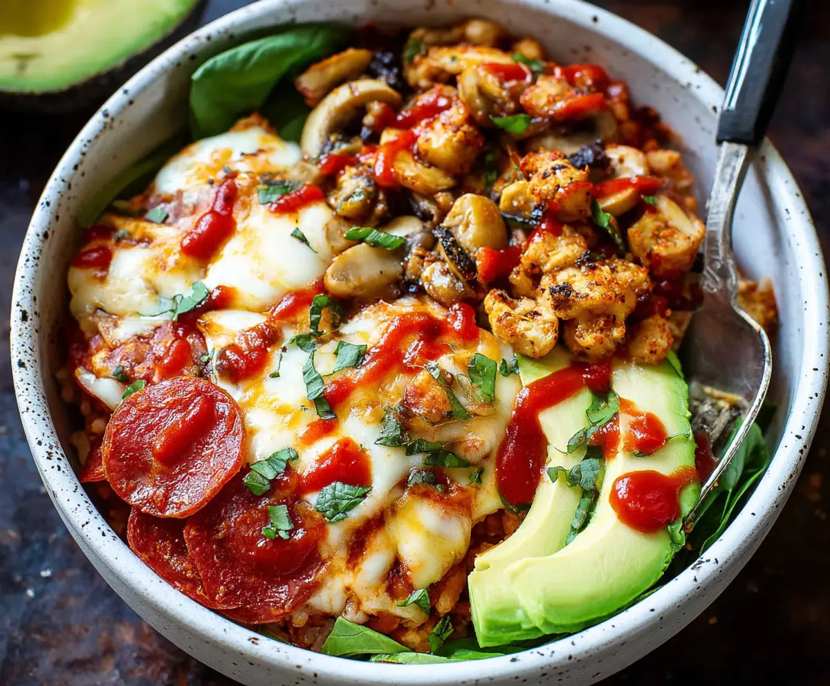 This Pizza Protein Bowl is a tasty twist on your favorite pizza! It’s packed with yummy ingredients like chicken, cheese, and fresh veggies all mixed together.