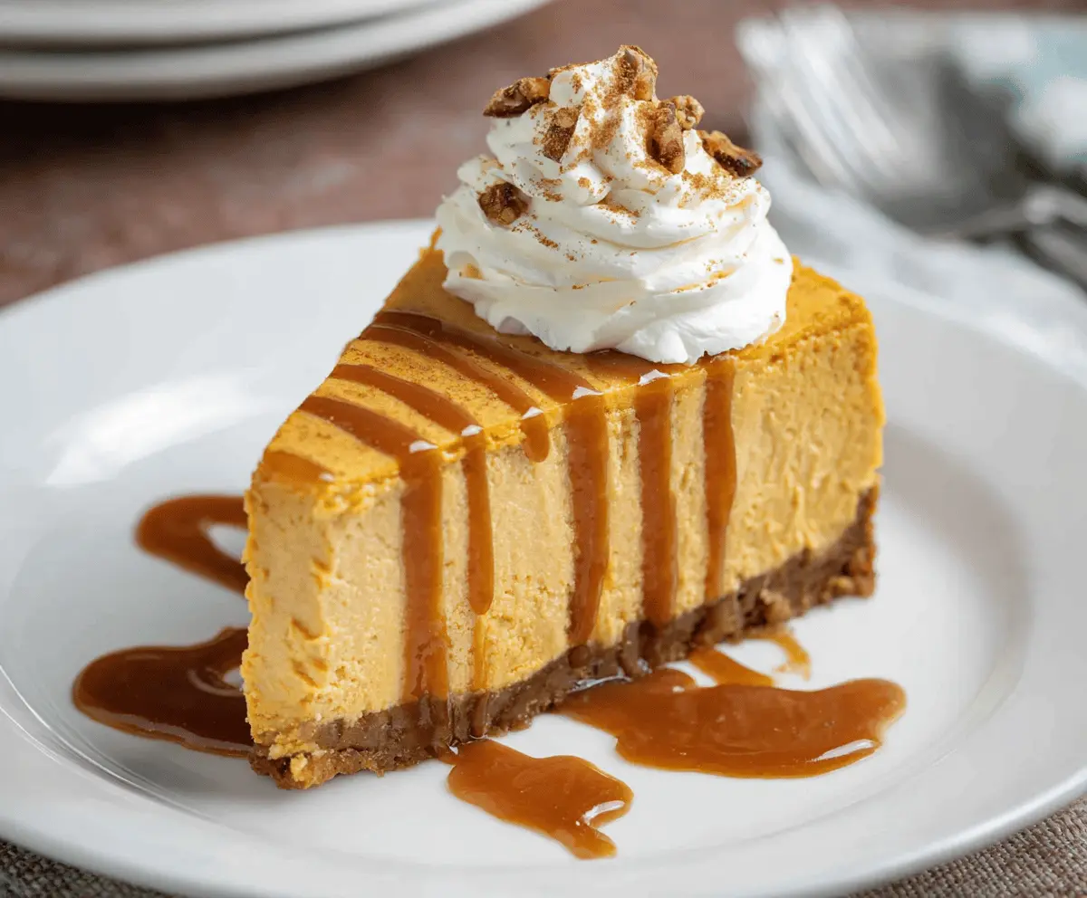 When you’re ready to serve, slice the cheesecake and top each piece with fluffy whipped cream, a drizzle of caramel sauce, and a sprinkle of cinnamon or pumpkin pie spice. Enjoy your delicious pumpkin spice cheesecake!