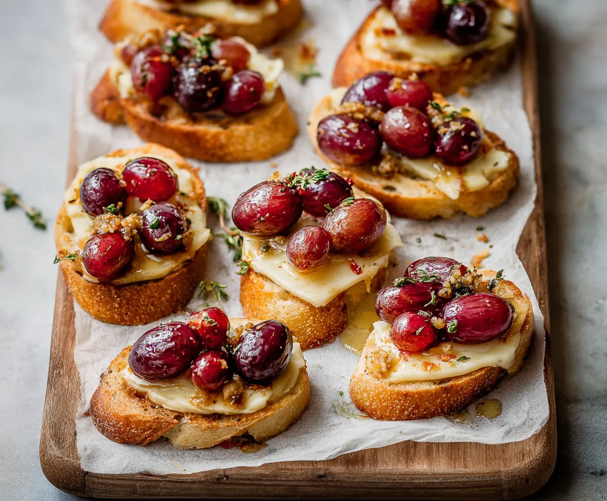 With creamy brie, juicy roasted grapes, and crunchy nuts on crispy bread, this recipe is sure to be a hit!