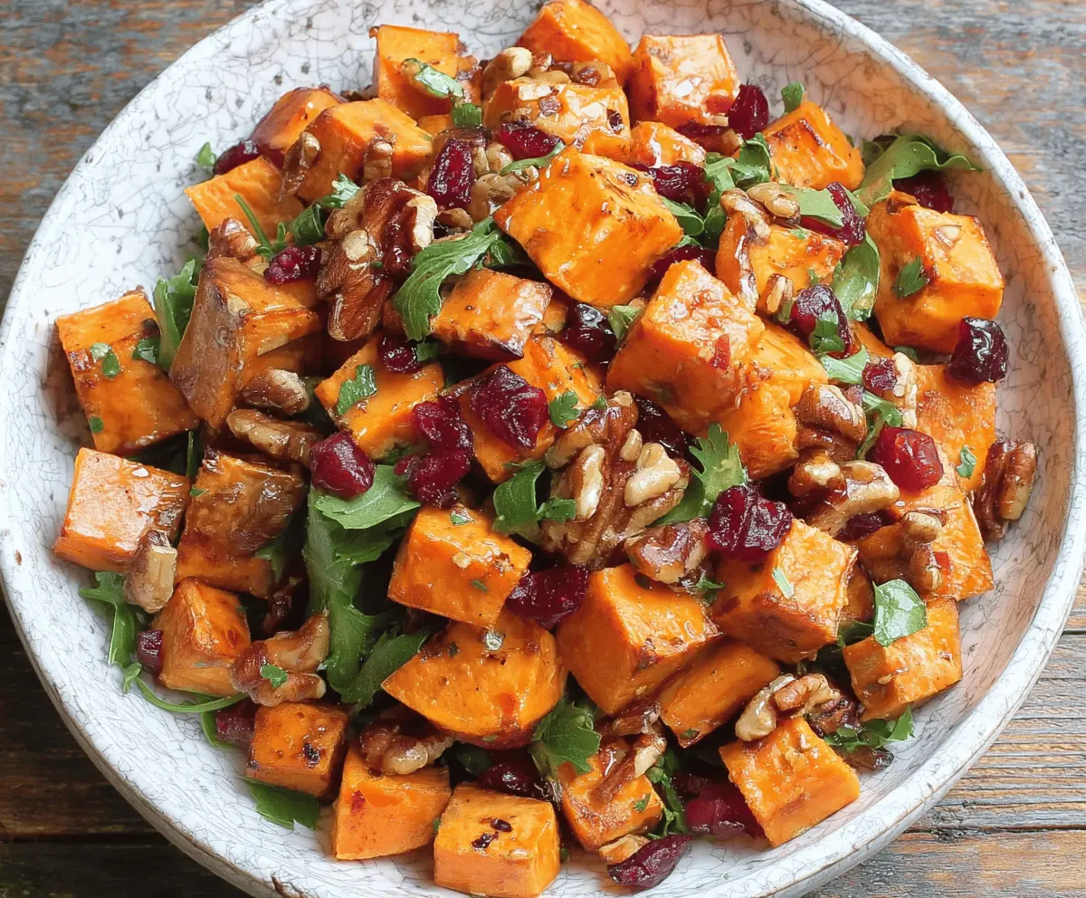 This Roasted Sweet Potato Salad is a colorful and tasty dish! It features tender sweet potatoes, crunchy greens, and some yummy toppings that make every bite exciting.