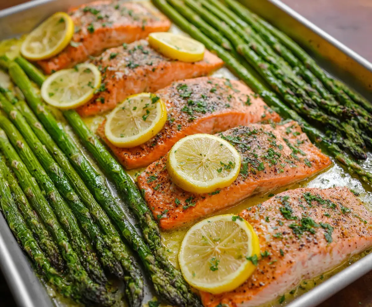 This Salmon and Asparagus Sheet Pan Dinner is a tasty and easy way to make a complete meal. Tender salmon fillets and bright green asparagus are seasoned and roasted together for a flavorful dish.