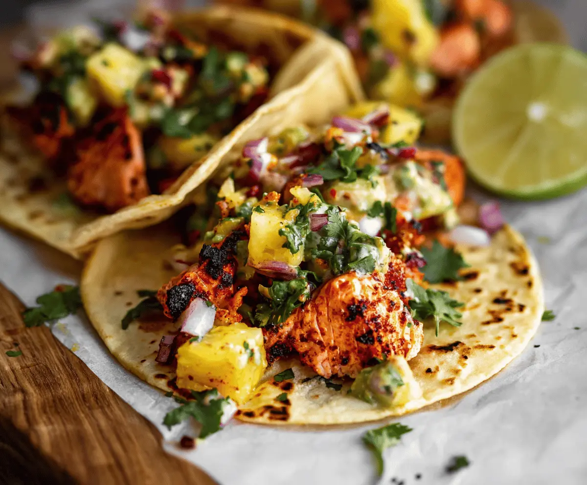 These delicious salmon tacos are a treat for your taste buds! They’re filled with tender salmon and topped with a fresh pineapple avocado salsa that adds a burst of flavor.