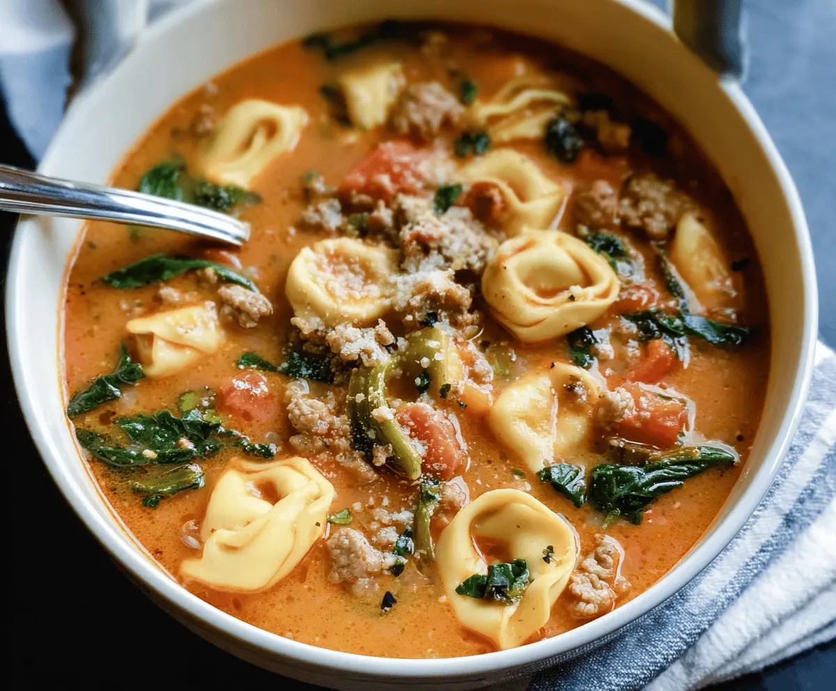 This creamy, savory soup combines rich sausage, tender tortellini, and fresh greens in a comforting tomato-cream broth. Enjoy your comforting bowl of Sausage Tortellini Soup!