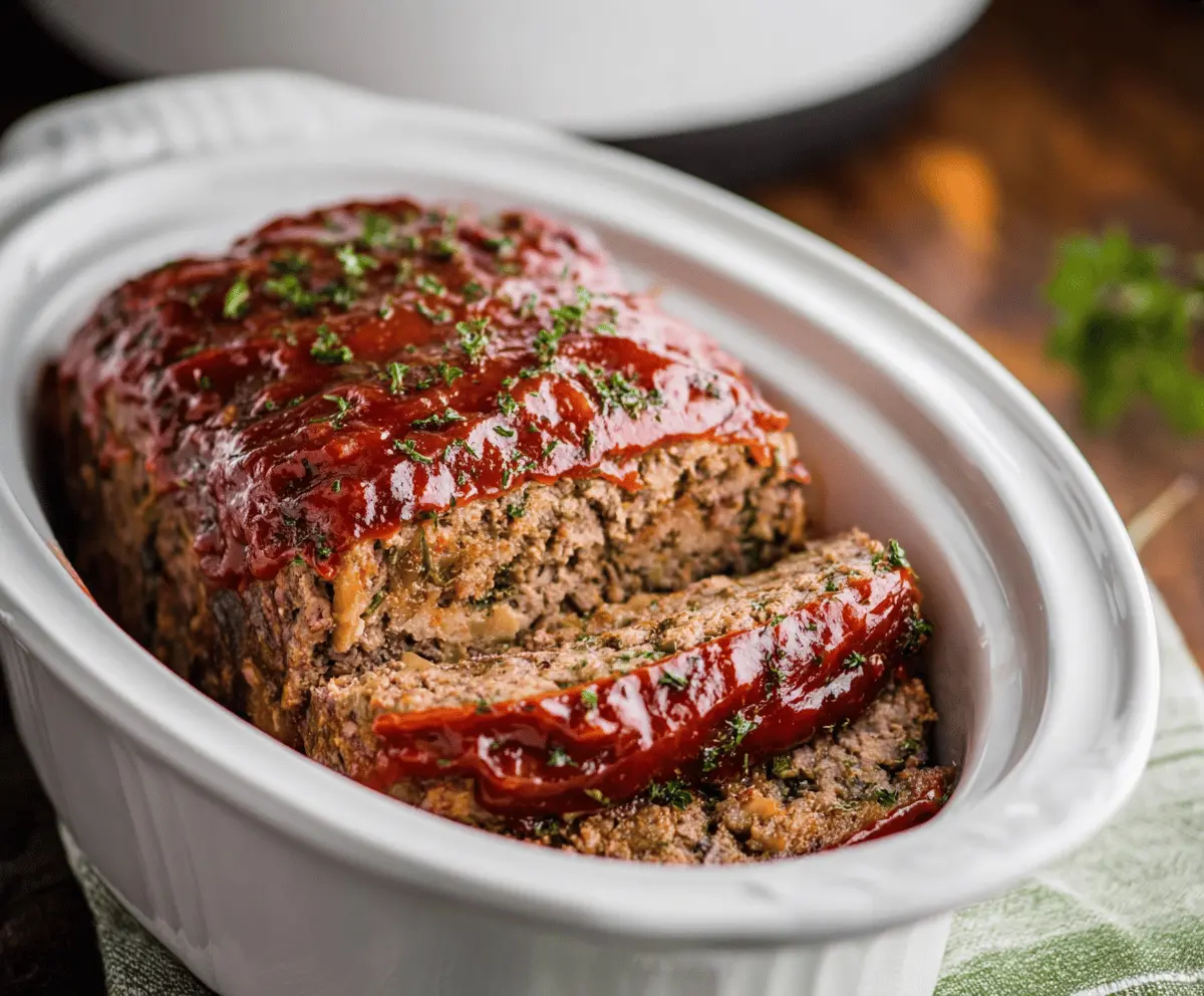 Once done, garnish with some chopped parsley if you like. Let it sit for a few minutes before slicing. Enjoy your tender, juicy slow cooker meatloaf with a delicious glaze!