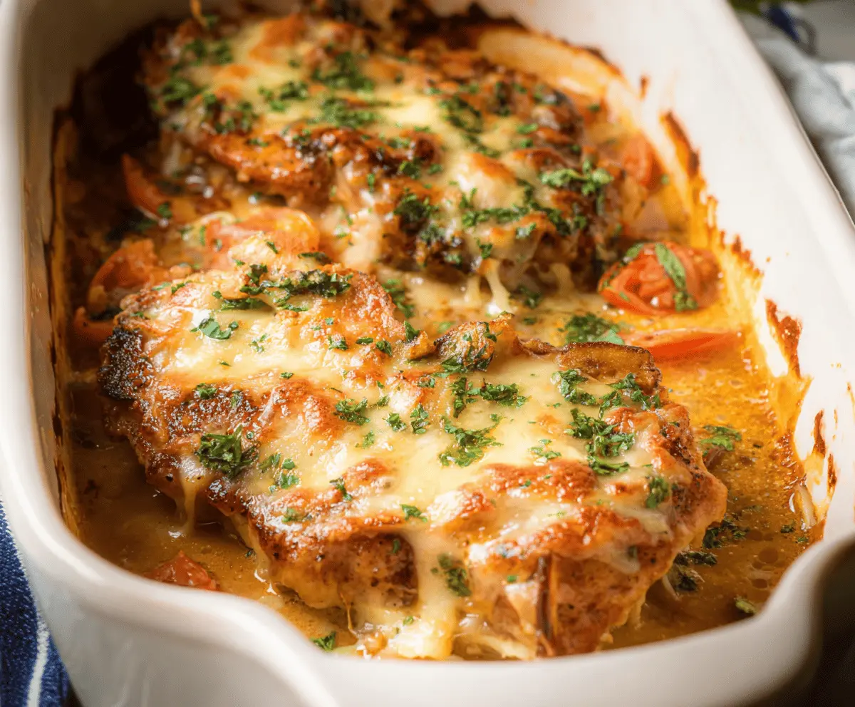 This casserole offers tender, juicy pork chops generously smothered in a creamy mushroom and onion gravy, topped with melted cheese and fresh parsley—absolutely delicious and perfect for an easy family dinner.