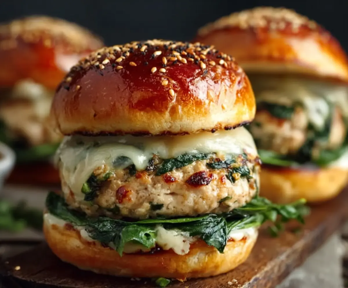 Once everything is ready, it’s time to assemble! Place the cooked patties on the bottom buns. You can add any remaining sautéed spinach if you like, followed by the melted cheese and spinach mixture. Top it off with the top buns.